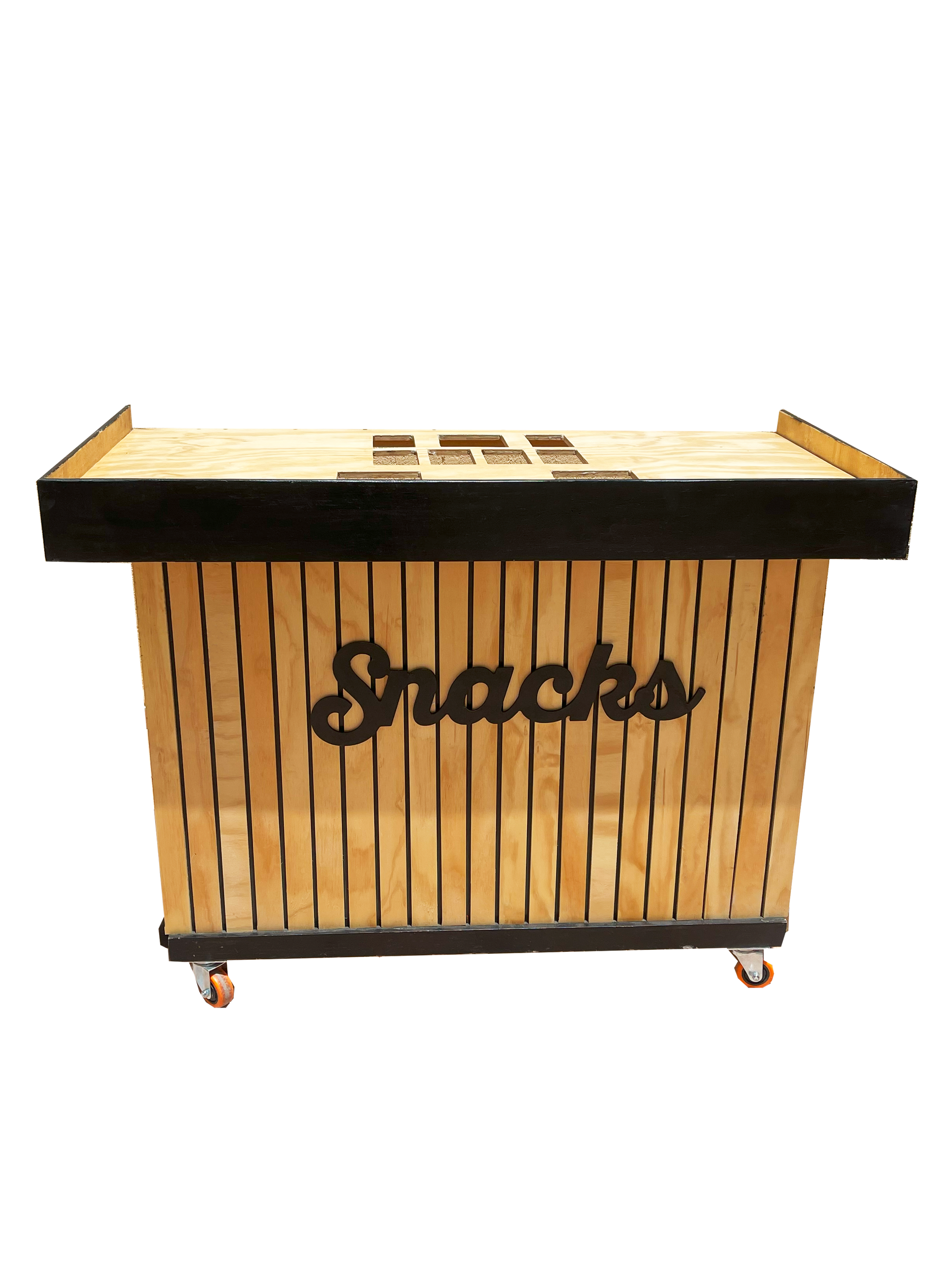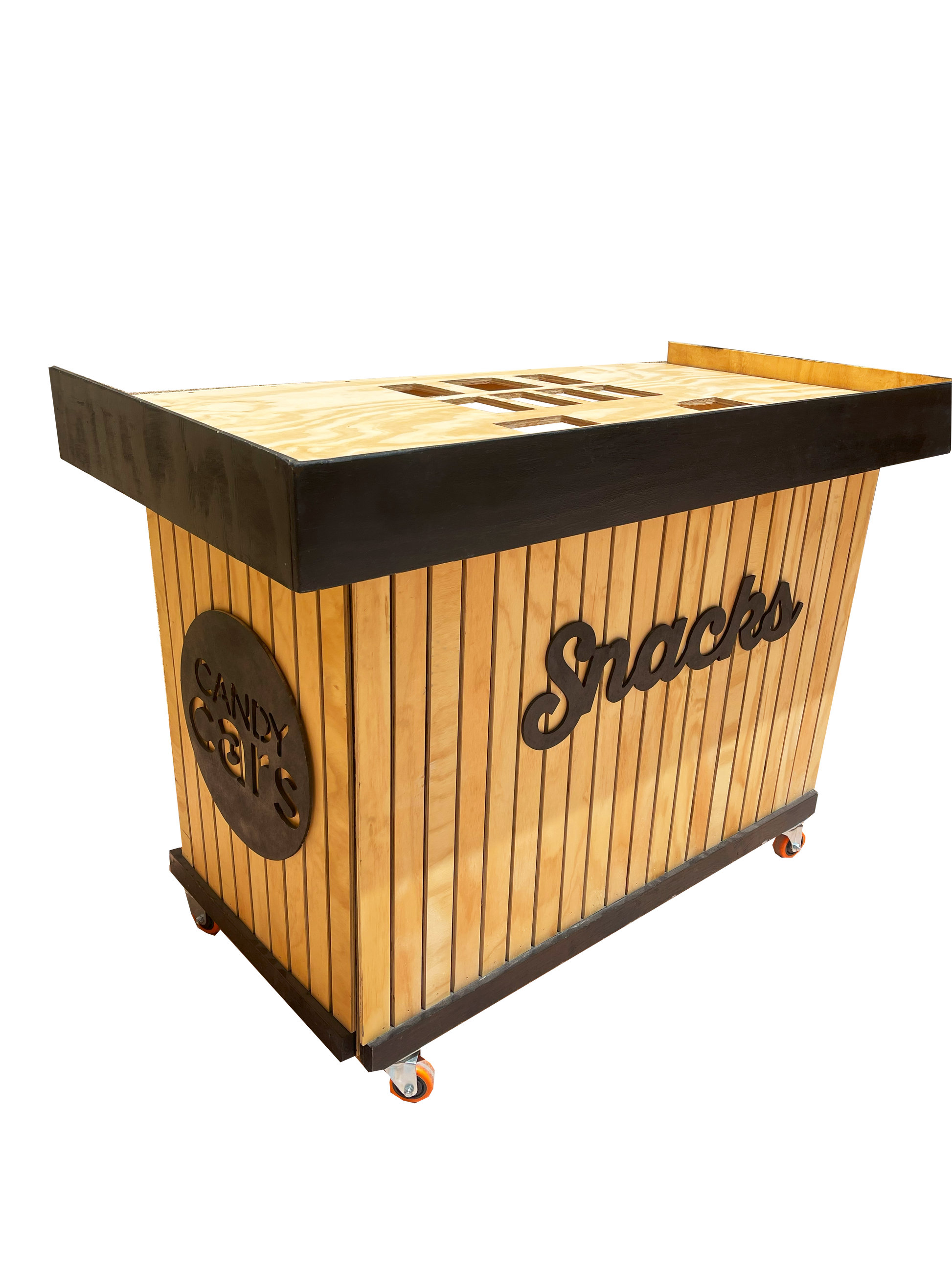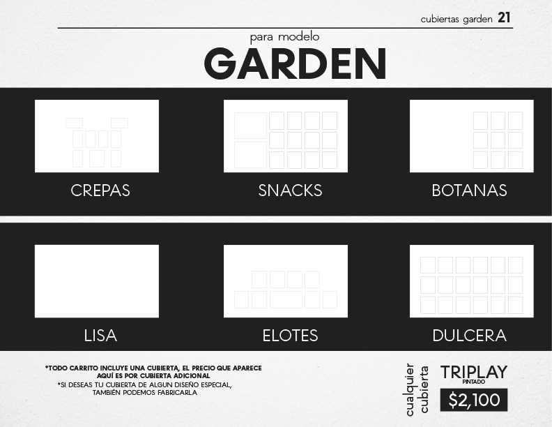 Carrito modelo Garden elaborado en triplay, sellado, areas negras esmaltadas y áreas naturales con barniz transparente. Incluye una palabra para el frente y dos logotipos de tu emprendimiento. Tú eliges la cubierta con la que lo deseas. Puedes personalizar tu cubierta.