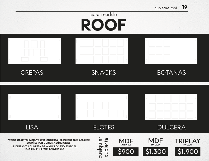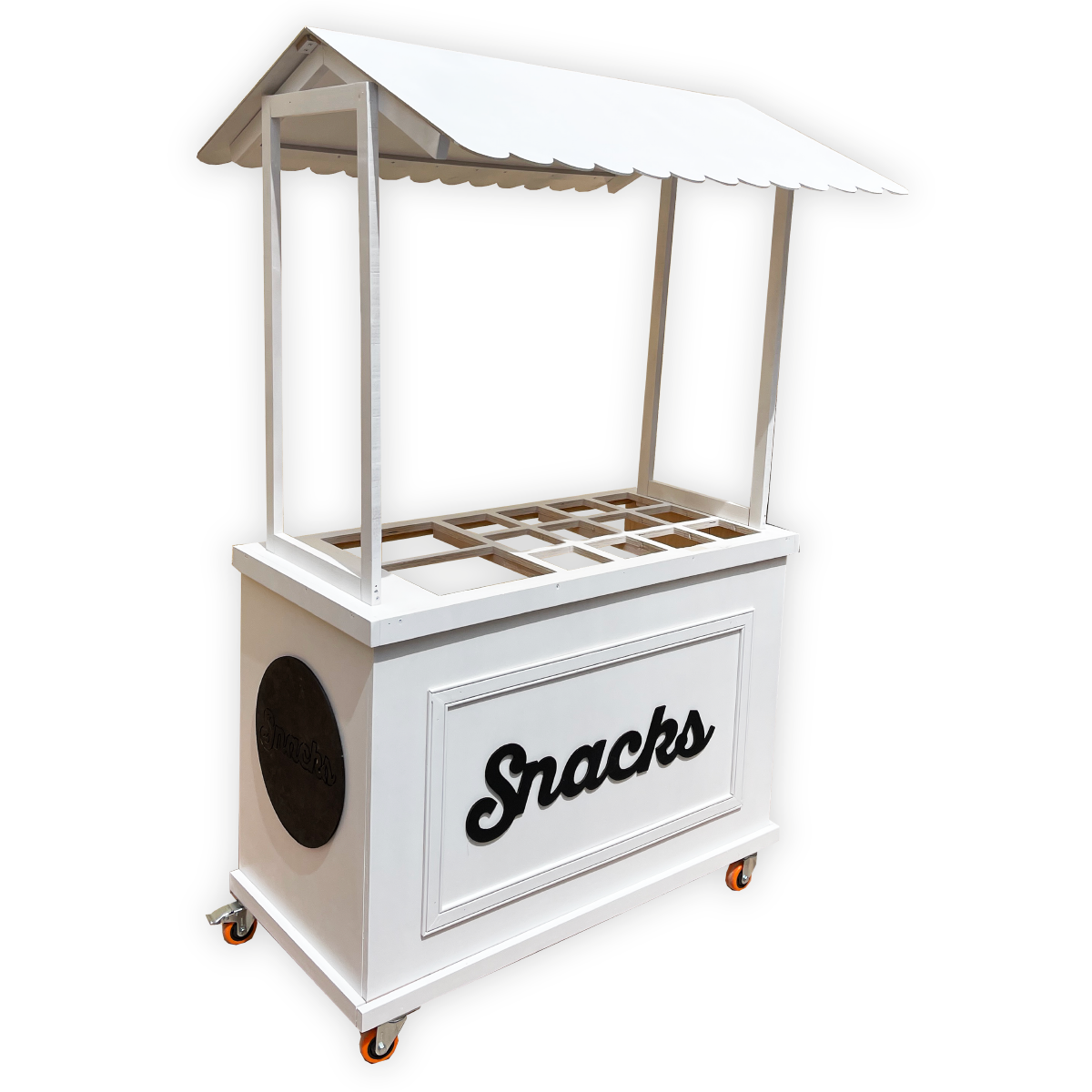 Carrito modelo roof elaborado en triplay o mdf a tu elección, pintado de color blanco. Incluye una palabra para el frente y dos logotipos de tu emprendimiento. Tú eliges la cubierta con la que lo deseas. Puedes personalizar tu cubierta.
