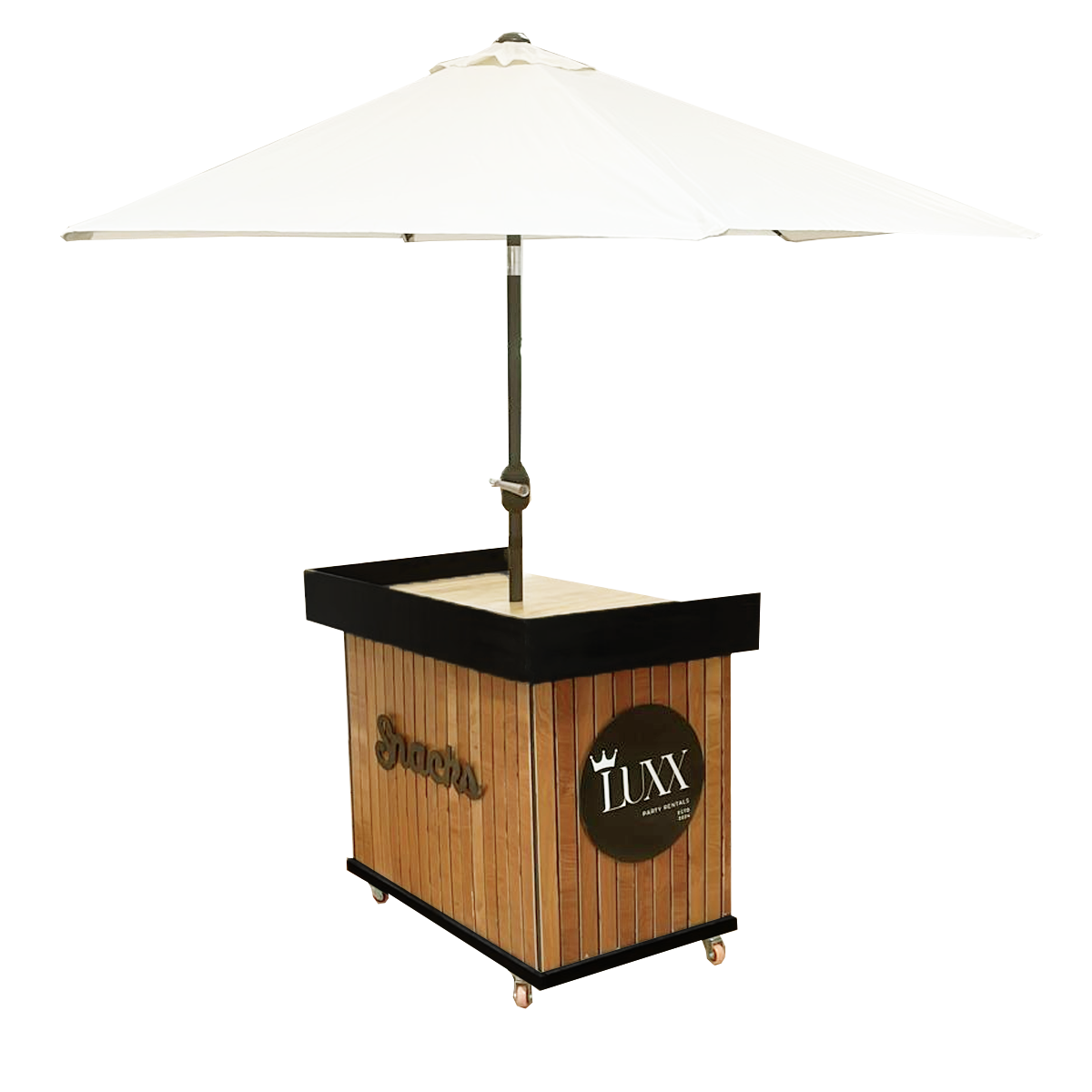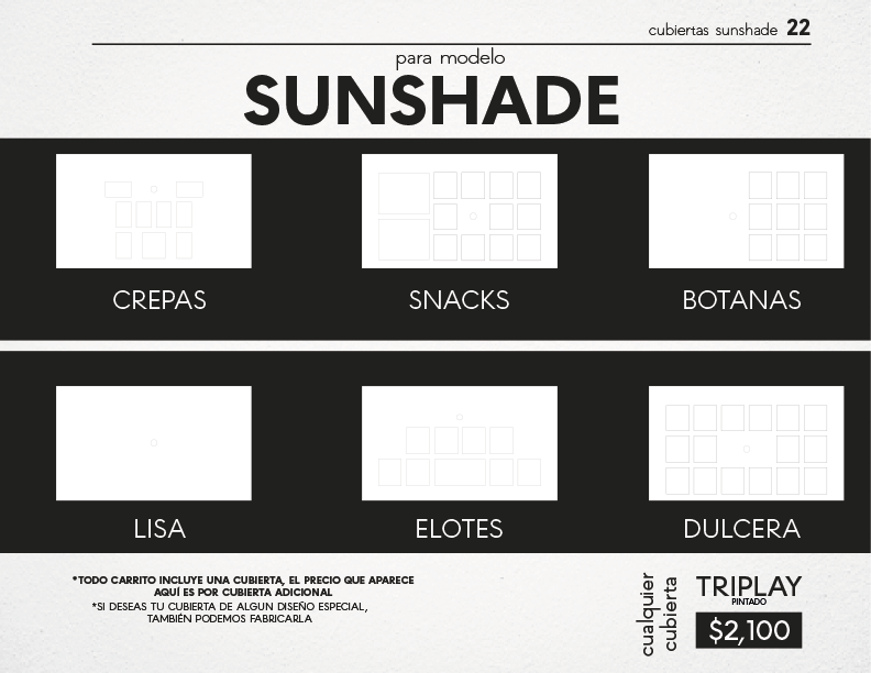 Carrito modelo Sunshade elaborado en triplay, sellado, areas negras esmaltadas y áreas naturales con barniz transparente. Incluye una palabra para el frente y dos logotipos de tu emprendimiento. Tú eliges la cubierta con la que lo deseas. Puedes personalizar tu cubierta.