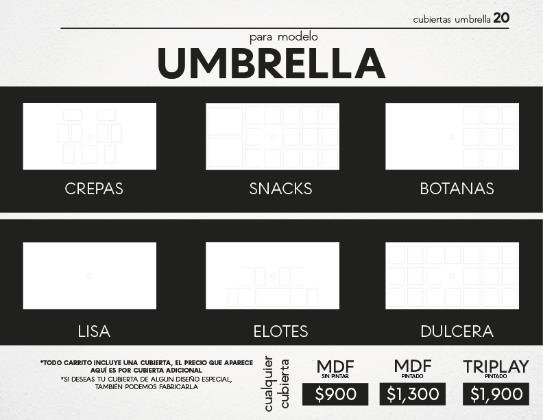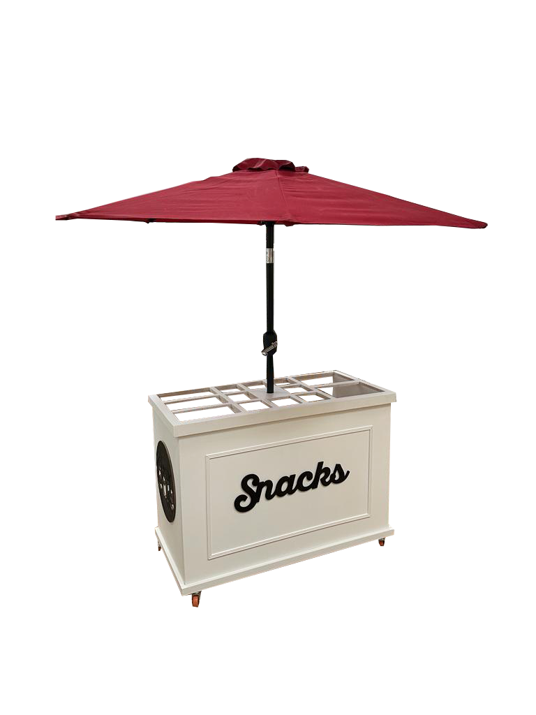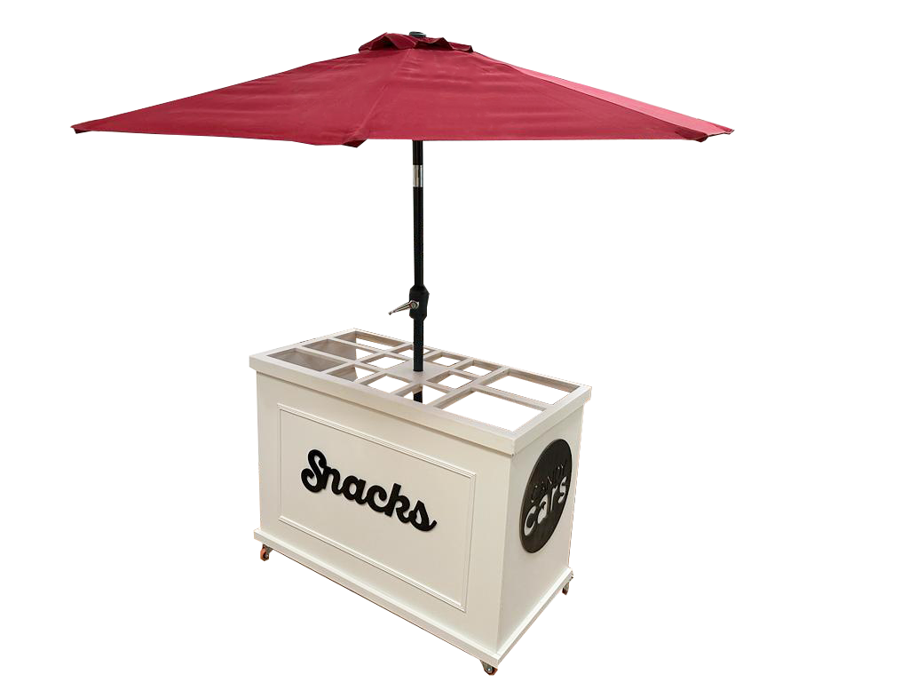Carrito modelo umbrella elaborado en triplay o mdf a tu elección, pintado de color blanco. Incluye una palabra para el frente y dos logotipos de tu emprendimiento. Tú eliges la cubierta con la que lo deseas. Puedes personalizar tu cubierta.
